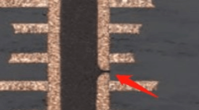 1.不可超过线宽30% 2.每面不可超过5点 3.每条线上不可超过3点 4.每点凹陷不能超出其线路铜厚度的20% |