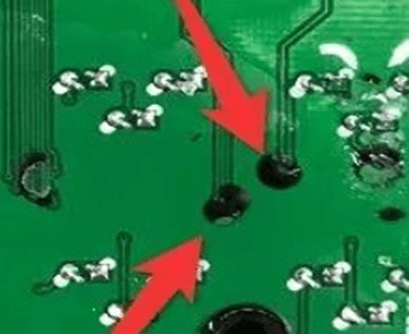 1)要求塞孔的导通孔允许油墨入孔。 2)双面开窗的导通孔和元件孔内残留油墨均不允收 | ![]() | |