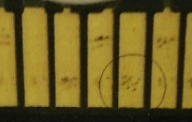 1.金面氧化不影响可焊性可接受,轻微色差不影响可焊性可以接受,颜色有明显变化不接受,接收整面颜色差异,单根手指颜色差异不接收 2.焊盘露铜、露镍不允收 3.铜面粗糙(光滑度较差)导致的色差(发暗/发白),不允许 4.表面处理前的打磨痕迹、划痕,以及表面处理后传送滚轮印产生的色差不允许. 5金面凹点、针孔、结瘤直径≤0.15mm,且同一焊盘上不可超过3个 6.金手指针孔、凹点、结瘤每根手指上的缺点数≤2点.总数不超过金手指总根数的 30%且在非关键区域上下各1/5 位置,每排金手指不超过3点允收 7.任何手指位沾锡、沾油墨、露铜都不允许接收 |